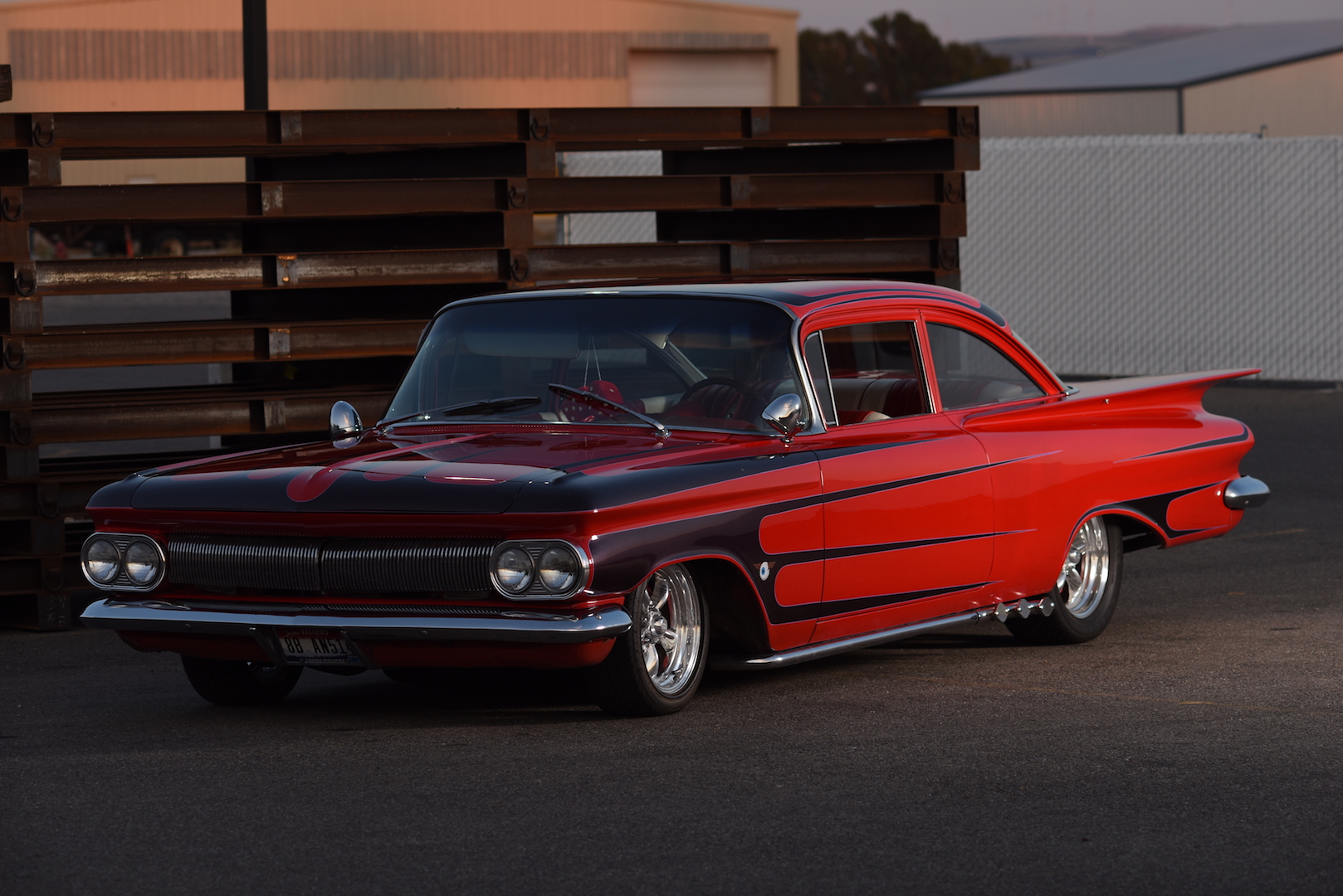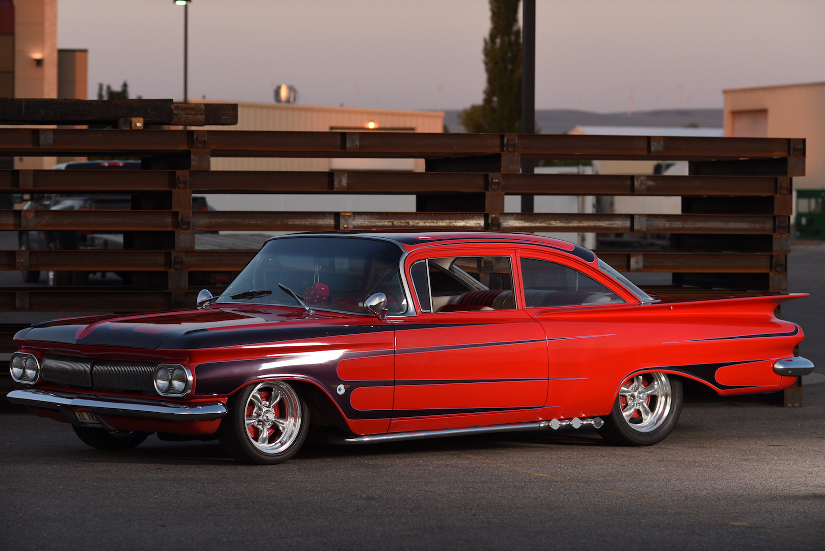1957 Chevy Bel Air.  Chevy 350 engine, shaved door handles, frenched-in antenna.  Scalloped blue and red paint job, red/white interior.