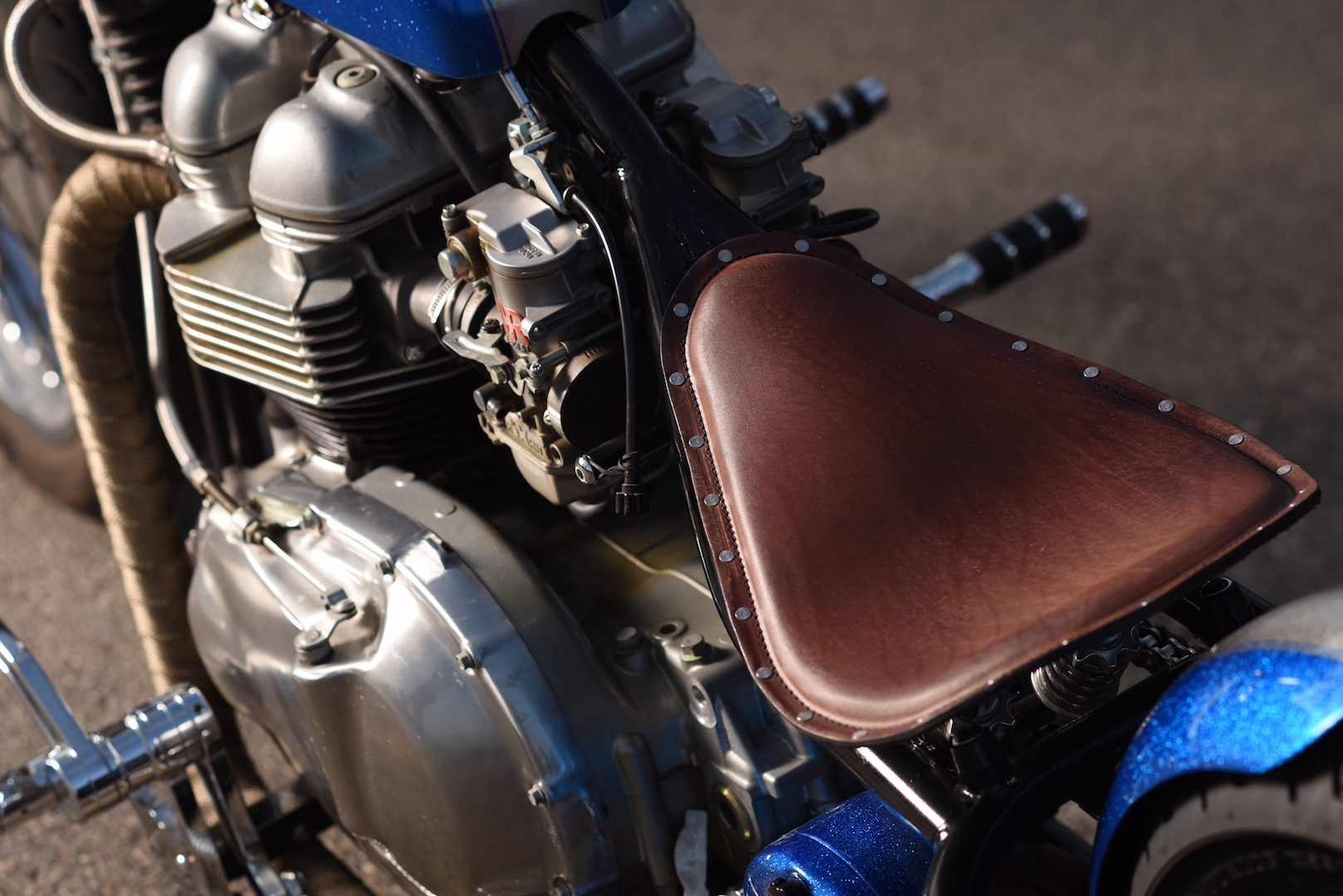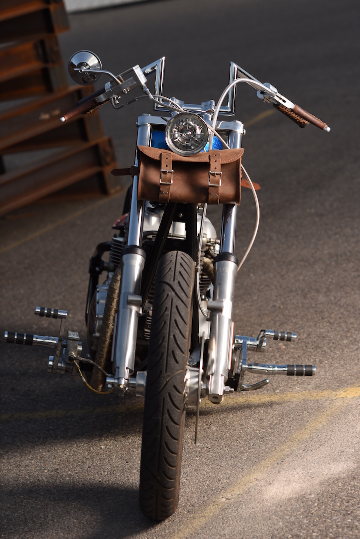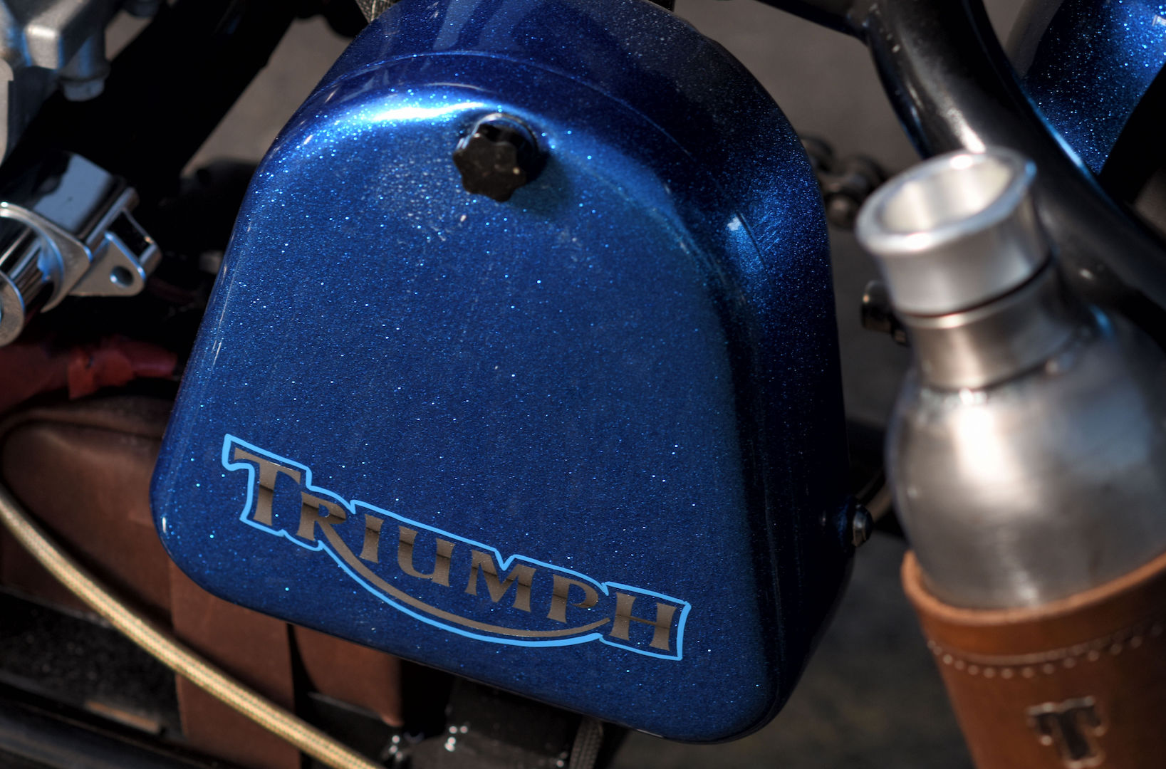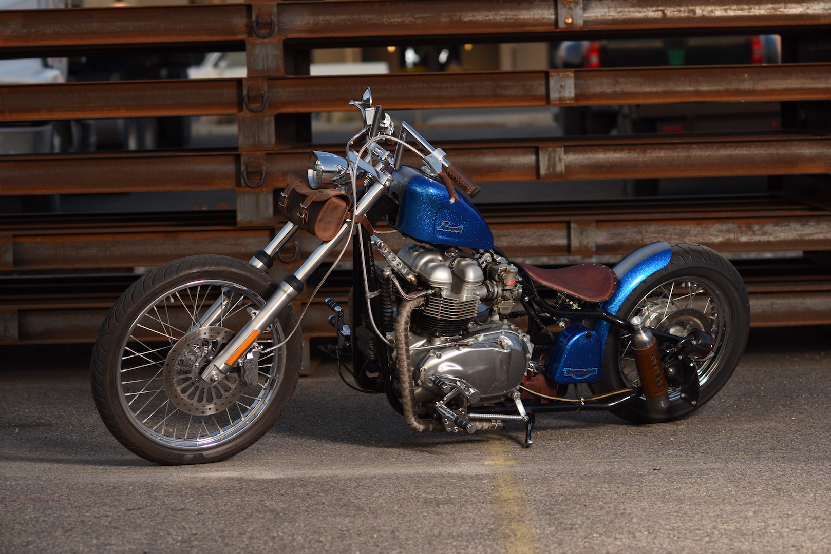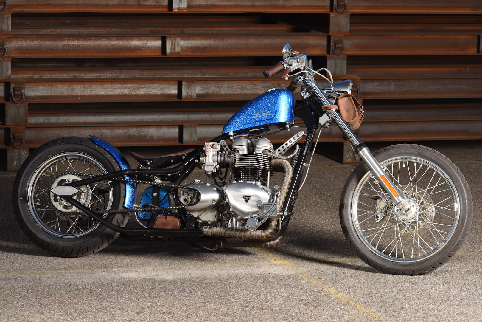 2002 Triumph Bonneville. Hard Tail bobber frame, fender, and tank. Leather wrapped hand grips and levers. Custom blue and silver metallic paint with hand-painted pintstripes.
